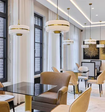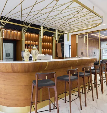 Стильное пространство с барной стойкой и атмосферными столиками. Собственная винотека позволит жильцам хранить свои коллекционные напитки. Прекрасное место для отдыха и общения.